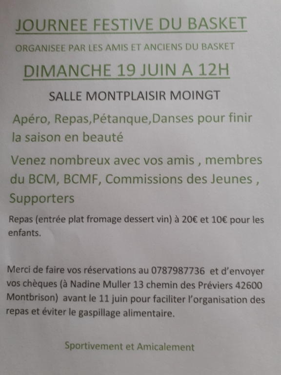 Le repas est à réserver avant le 11 juin au 07 87 98 77 36. Vous pouvez envoyer le chèque à Nadine Muller (13 chemin des Préviers 42600)